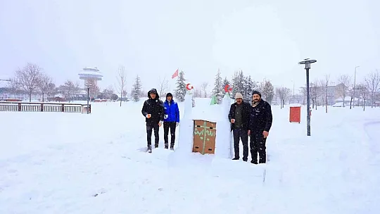 Elazığ'da bir grup arkadaş, bir parkta kardan ilginç bir çalışmaya imza attı. Kardan 2 minareli cami yapan arkadaşlar minarelere de ay yıldız yerleştirdiler.