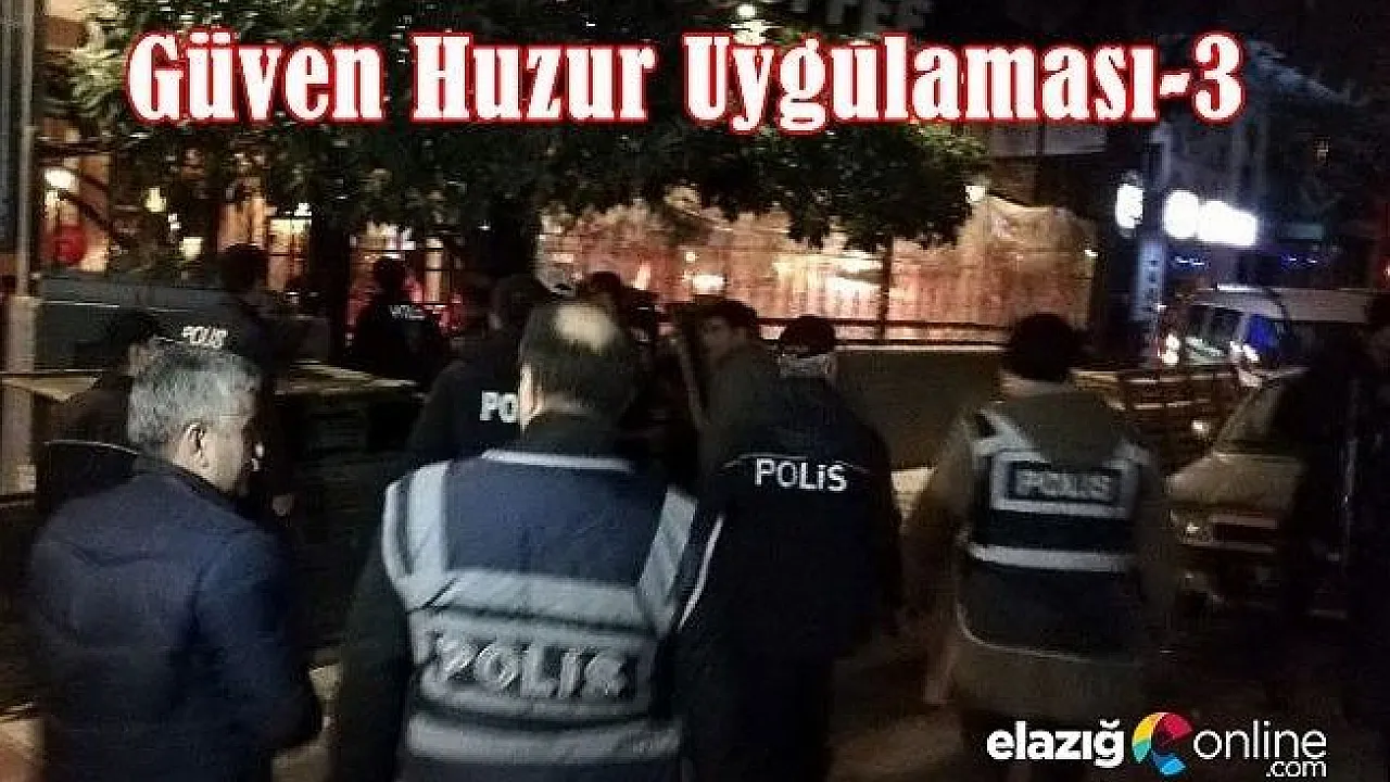 Türkiye genelinde Emniyet Müdürlüğü ekiplerince 'Güven Huzur Uygulaması-3' gerçekleştirildi. Bu uygulama kapsamında Elazığ Valiliği koordinesinde Elazığ İl Emniyet Müdürlüğü ekipleri tarafından Elazığ'da da uygulama gerçekleşti. Gerçekleşen uygulamada 2 Bin 720 şahıs sorgulandı.