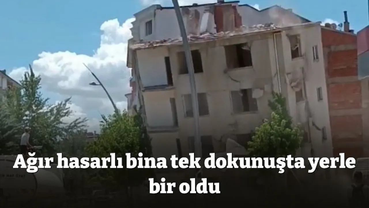 Ağır hasarlı bina tek dokunuşta yerle bir oldu