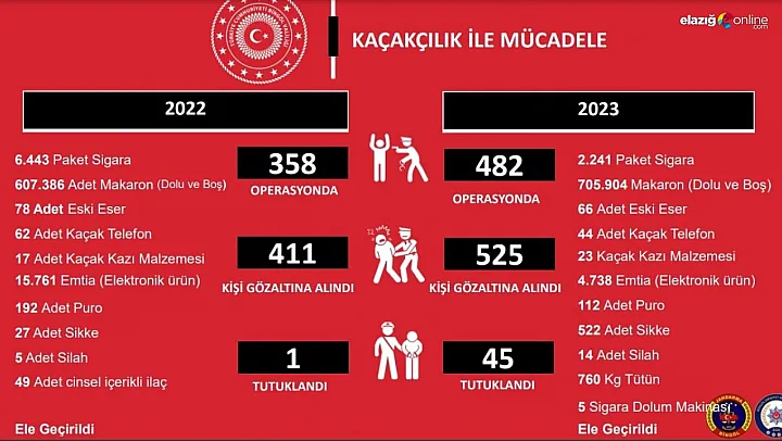 Bingöl'de 2023 yılında kaçakçılıkla mücadele kapsamında yapılan 482 operasyonda, 525 kişi gözaltına alınırken, 45 kişi tutuklandı.