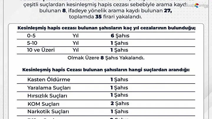 Öte yandan aranan şahıslara yönelik düzenlenen operasyonlarda, çeşitli suçlardan haklarında kesinleşmiş hapis cezası bulunan 8, ifadeye yönelik arama kaydı bulunan 27 kişi olmak üzere toplam 35 firarinin yakalandığı aktarıldı.
