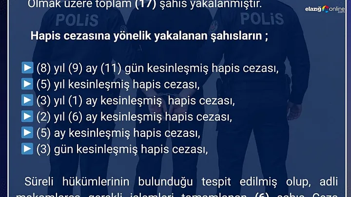 Bingöl İl Emniyet Müdürlüğü ekiplerince 5-12 Eylül 2025 tarihleri arasında gerçekleştirilen çalışmalarda, haklarında çeşitli suçlardan arama kaydı bulunan 17 kişi yakalandı. Yapılan çalışmalarda, haklarında kesinleşmiş hapis cezası bulunan 6 şahıs tutuklanarak cezaevine gönderildi.