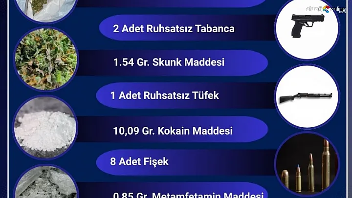 Çalışmalar kapsamında 1.794 gram kubar esrar, 1.54 gram skunk, 10.09 gram kokain, 0.85 gram metamfetamin, 2 adet ruhsatsız tabanca, 1 adet ruhsatsız tüfek, 8 adet fişek ve 1 adet bıçak ele geçirildiği bildirildi.