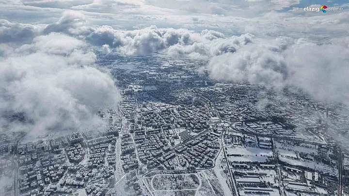 Tarihi mahalleden havalanan dronlar, kentin üzerine yorgan gibi serilen sis bulutlarını ve altındaki karla kaplı binaları saniye saniye kaydetti. Gökyüzünden bakıldığında sadece yüksek binaların uçlarının seçilebildiği o anlar, Elazığ'ın doğal güzelliğini bir kez daha gözler önüne serdi.