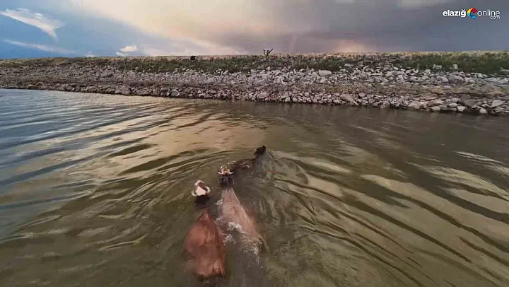 Diyarbakır Devegeçidi Barajında kaydedilen görüntüler izleyenleri hem şaşırttı hem gülümsetti. Sıcak havadan bunalan üç büyükbaş hayvanın baraj göletinde serinlediği anlar, dron kamerasına yansıdı. Aynı bölgede otlayan koyun sürüsü de deponun sesi ve hareketinden ürkerek panikle kaçmaya başladı. Koyunların telaşla dağılması renkli ve ilginç görüntüler ortaya çıkardı.