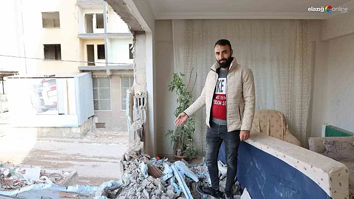 Elazığ'da depremlerin yol açtığı ağır hasar nedeniyle bazı binaların yıkım işlemleri sürüyor. Bu bağlamda Sanayi Mahallesi Ender Sokak'ta bulunan bir binanın yıkımına başlandı. Ancak yıkım işlemi sırasında iş makinesinin hata yapması sonucu, yanı başındaki sağlam bir binanın birinci katındaki odaların duvarları da yıkıldı.
