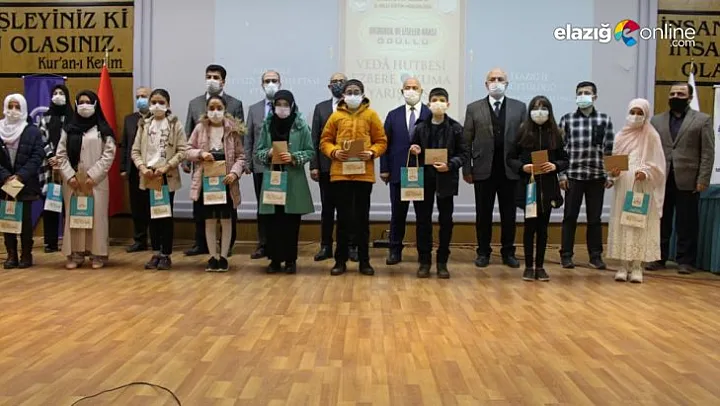 Elazığ İl Müftülüğü ve Milli Eğitim İl Müdürlüğü işbirliği ile ortaokullarda “Ezbere Veda Hutbesi Okuma Yarışması” gerçekleştirildi. Ortaokullarda yapılan elemeler sonrası il finaline kalan 10 öğrenci arasında yapılan yarışma Müftülük Sitesi Edibe Can Konferans Salonu'nda icra edildi.