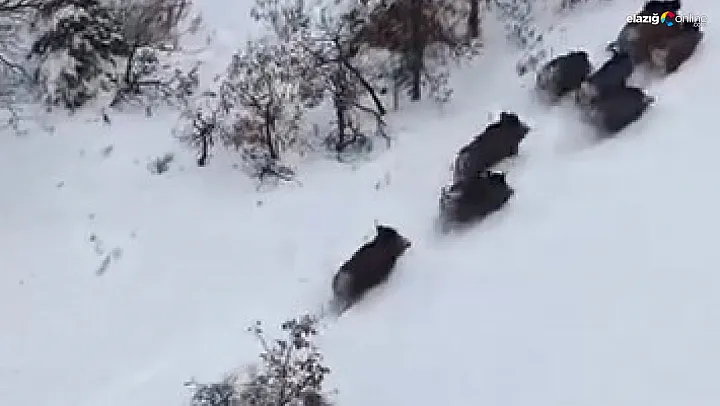 Elazığ'ın Ağın ilçesinde, Keban Baraj Gölü'nün eşsiz manzarasına karşı karlar üzerinde koşan domuz sürüsü kameralara yansıdı. Doğada gezintiye çıkan bir vatandaşın dronuna yakalanan onlarca yaban domuzu, sarp kayalıklar arasında kısa sürede izini kaybettirdi.