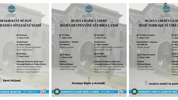 Diyarbakır Büyükşehir Belediyesi Cemilpaşa Konağı Kent Müzesinde Kasım ayı boyunca çeşitli başlıklarda, akademisyen, eğitimci, yazar ve arkeologların katılacağı kültürel hafıza söyleşileri düzenleyecek.