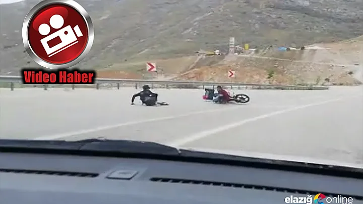 Elazığ'da üzerinde 2 kişinin bulunduğu motosikletin seyir halindeyken devrilme anı, cep telefonu kamerası ile saniye saniye kaydedildi.