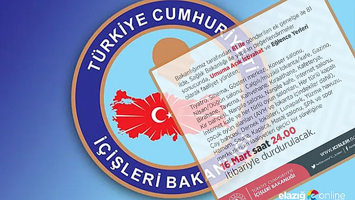 İçişleri Bakanlığı 81 İl Valiliğine Coronavirüs konulu ek bir genelge daha gönderdi. Genelge ile 81 ilde, tiyatro, sinema, gösteri merkezi, konser salonu, nişan/düğün salonu, çalgılı/müzikli lokanta/kafe, gazino, birahane, taverna, kahvehane, kıraathane, kafeterya, kır bahçesi, nargile salonu, nargile kafe, internet salonu, internet kafe, her türlü oyun salonları, her türlü kapalı çocuk oyun alanları (AVM ve lokanta içindekiler dahil), çay bahçesi, dernek lokalleri, lunapark, yüzme havuzu, hamam, sauna, kaplıca, masaj salonu, SPA ve spor merkezlerinin faaliyetleri geçici bir süreliğine bugün saat 24:00 itibariyle durdurulacak. Çin'in Vuhan kentinde başlayarak tüm Dünyayı tehdit etmeye devam eden ve Dünya Sağlık Örgütü tarafından pandemi olarak nitelendirilen Coronavirüs (Kovid-19) salgınından vatandaşları korumak ve salgının yayılmasını engellemek amacıyla önlemler alınmaya devam ediyor.
