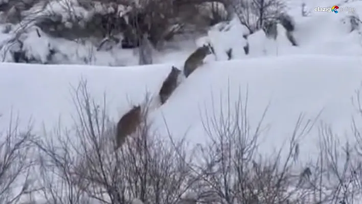 Elazığ'ın Gözeli köyü Tarlatepe mezrasında, yoğun kar yağışı sonrası yiyecek bulmakta zorlanan bir kurt sürüsü yerleşim yerinin yakınına kadar geldi. Karla kaplı arazide tek sıra halinde ilerleyen kurtların o anları, bir vatandaşın cep telefonu kamerasına anbean yansıdı.