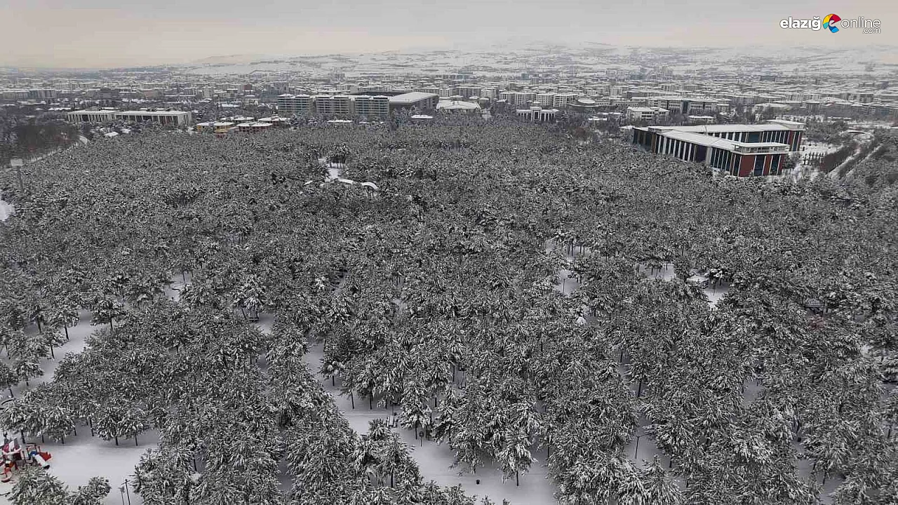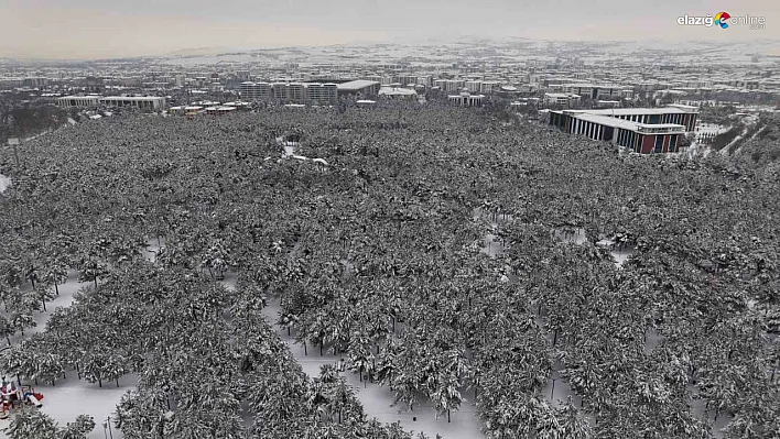 Elazığ'da dondurucu soğuklarla birlikte gelen kar yağışı, kentin merkezindeki yeşil alanları adeta beyaz bir örtüyle mühürledi. Fırat Üniversitesi'nin simgesi olan ormanlık alan ve Kültür Park'ta oluşan kartpostallık manzaralar, havadan çekilen görüntülerle şehrin gri çehresini bir anda değiştirdi.