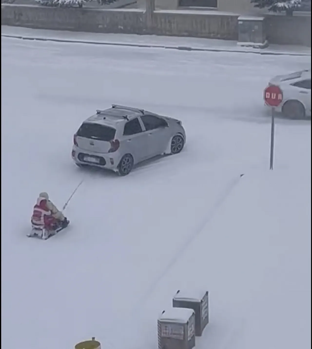 Kenti etkisi altına alan yoğun kar yağışını fırsat bilen bazı gençler, trafiğin aktığı yolda otomobilin arkasına bağladıkları kızakla kilometrelerce yol katetti. O tehlikeli anlar vatandaşların cep telefonu kamerasına anbean yansıdı.