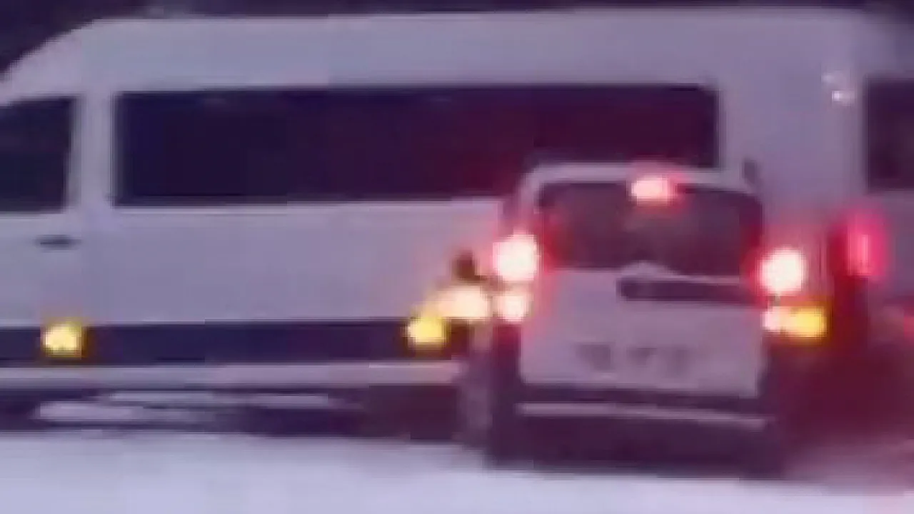 O anlara tanıklık eden bir vatandaş, yaşananları cep telefonuyla saniye saniye kaydetti. Görüntülerde, hafif ticari aracın fren yapmasına rağmen kayarak minibüse vurduğu görülüyor.