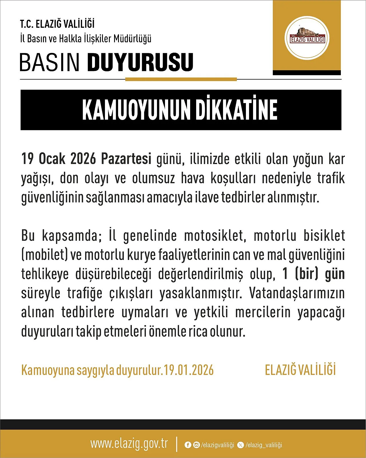 19 Ocak akşamı yapılan resmi duyuruyla birlikte, 20 Ocak Salı günü gün boyu sürecek olan yasak kararı yürürlüğe girdi. Alınan karar doğrultusunda motosikletler, motorlu bisikletler ve özellikle son yıllarda şehir içi trafiğinde yoğunluk oluşturan motorlu kuryeler yarın Elazığ semalarında ve sokaklarında hizmet veremeyecek.