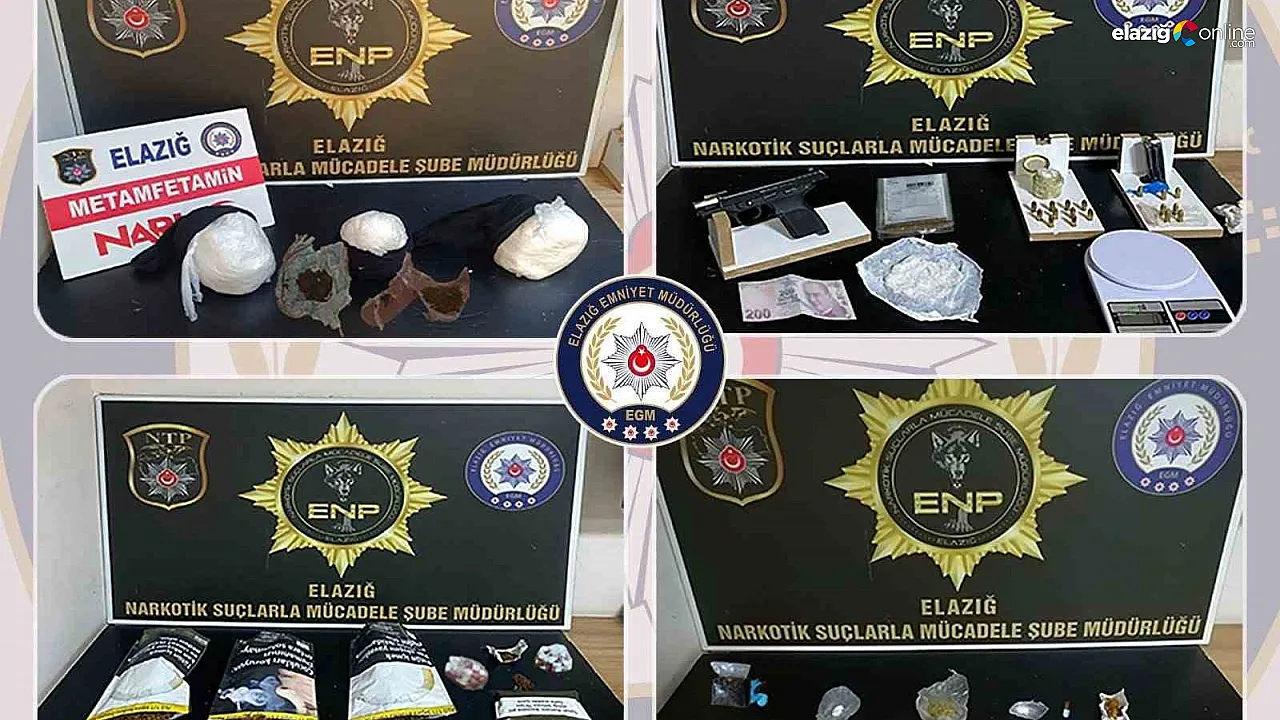 Elazığ İl Emniyet Müdürlüğü Narkotik Suçlarla Mücadele Şube Müdürlüğü ekipleri, uyuşturucu madde ticareti, sevkiyatı ve kullanımını önlemek amacıyla geniş çaplı operasyonlar düzenliyor. Son operasyonlarda önemli miktarda uyuşturucu madde ve silah ele geçirildi.