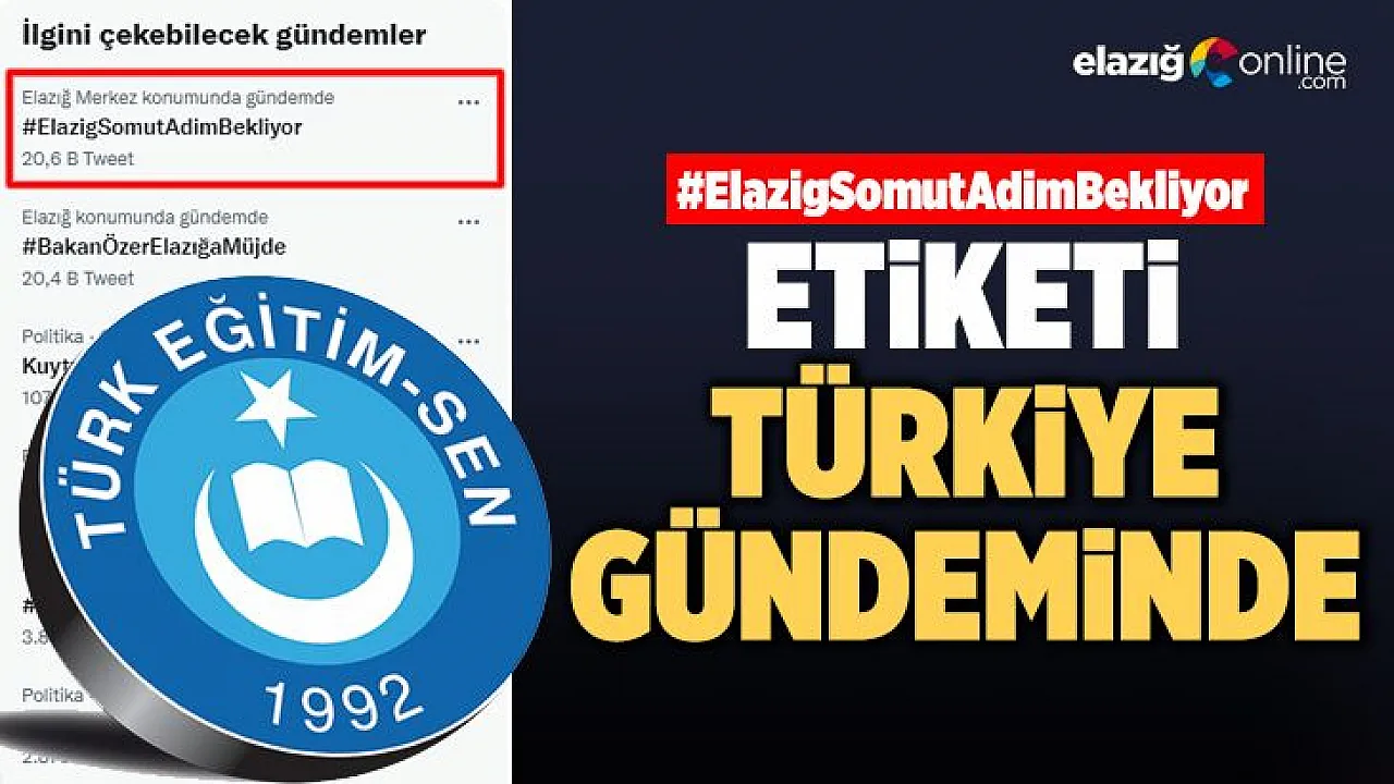 Eğitim Bir-Sen Elazığ Şubesi'nin #BakanÖzerElazığaMüjde hasthagı gündem çalışmasının Türkiye gündeminde 1. sıraya oturmasından sonra, Türk Eğitim-Sen Elazığ Şubesi'nin de sosyal medya platformu twitterda gerçekleştirmiş olduğu #ElazigSomutAdimBekliyor hasthagı Türkiye gündeminde 1. sıraya oturmayı başardı.