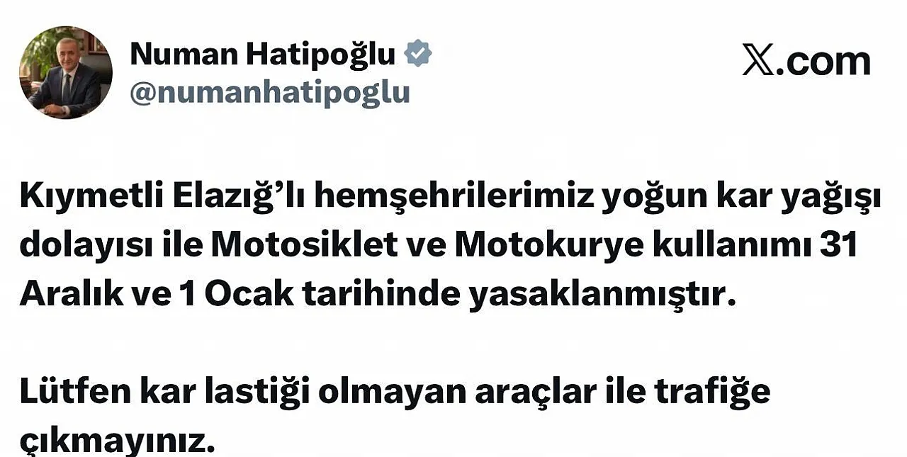 Vali Hatipoğlu, alınan kararla ilgili yaptığı açıklamada, “Yoğun kar yağışı ve buzlanma riski nedeniyle 31 Aralık ve 1 Ocak tarihlerinde motosiklet ve motokurye kullanımına izin verilmeyecektir. Vatandaşlarımızdan kar lastiği olmayan araçlarla trafiğe çıkmamalarını özellikle rica ediyoruz” ifadelerini kullandı.