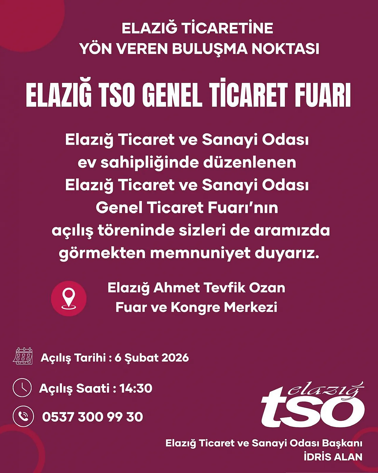 "Biz bu fuarı sıradan bir etkinlik olarak değil, Elazığ için başlattığımız büyük değişim sürecinin önemli bir halkası olarak görüyoruz. 6. Bölge teşviklerinden finansman sorunlarına kadar her alanda Ankara’da yürüttüğümüz temasların meyvesini, şimdi bu dev ticaret platformuyla taçlandırıyoruz. Amacımız sadece ürün sergilemek değil; yeni iş bağlantıları kurmak ve üyelerimizin pazar payını artırmaktır."