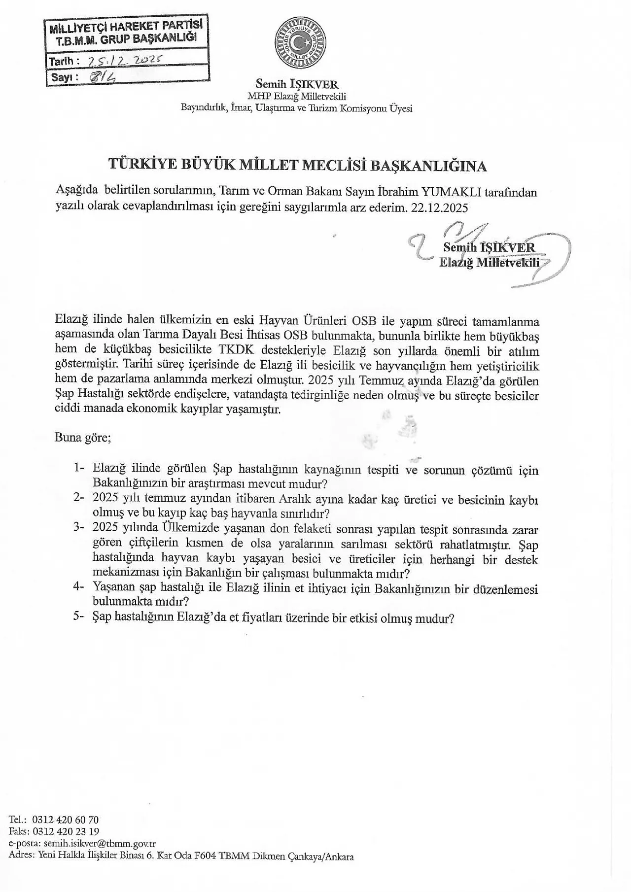 MHP Elazığ Milletvekili Semih Işıkver, kentte geçtiğimiz yaz patlak veren ve hayvancılık sektörünü vuran şap hastalığını TBMM gündemine taşıdı. Bakan Yumaklı'ya soru önergesi veren Işıkver, mağdur olan üreticiye 'don felaketi' modelinde bir destek verilip verilmeyeceğini sordu.