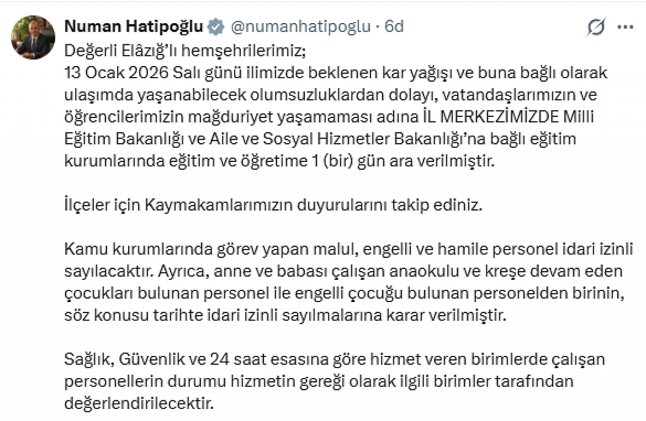 Elazığ'da beklenen yoğun kar yağışı ve buzlanma riski üzerine Valilikten flaş karar geldi. Vali Numan Hatipoğlu, 13 Ocak Salı günü il merkezindeki okulların tatil edildiğini duyururken, hamile ve engelli kamu personeline de idari izin verildiğini açıkladı.