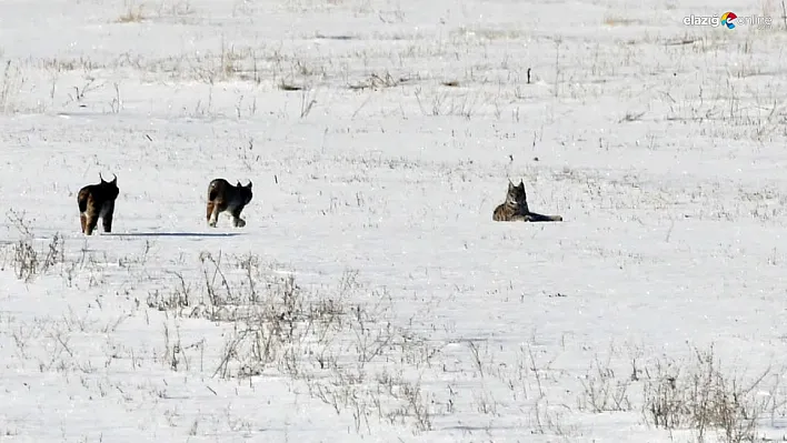 Elazığ'ın Karakoçan ilçesinde, dünyada nesli tükenme tehlikesiyle karşı karşıya olan vaşak ailesi, karla kaplı arazide yiyecek ararken görüntülendi. Beydere köyü yakınlarına kadar sokulan 'ormanın hayaleti' lakaplı canlılar, bölge sakinlerine unutulmaz bir tanıklık yaşattı.