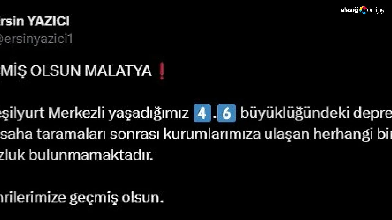 Malatya Valisi Ersin Yazıcı, saha tarama çalışmaları sonucu olumsuz bir duruma rastlanmadığını açıklayarak, "İlimiz Yeşilyurt merkezli yaşadığımız 4.6 büyüklüğündeki depremde yapılan saha taramaları sonrası kurumlarımıza ulaşan herhangi bir olumsuzluk bulunmamaktadır. Hemşerilerimize geçmiş olsun" ifadelerini kullandı.