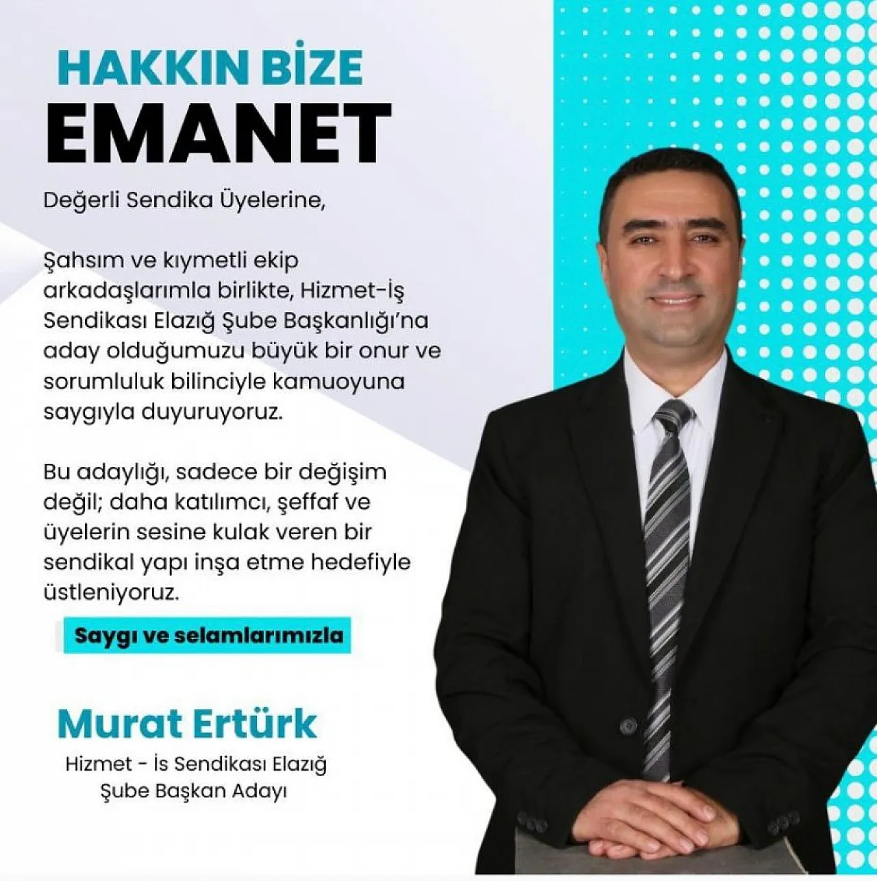 Elazığ Belediyesi çalışanı Murat Ertürk, Hizmet-İş Sendikası Elazığ Şube Başkanlığı için adaylığını duyurdu. 'Artık söz üyede olacak' diyerek değişim mesajı veren Ertürk, sendikada daha katılımcı ve şeffaf bir yönetim anlayışı hedeflediklerini belirtti.