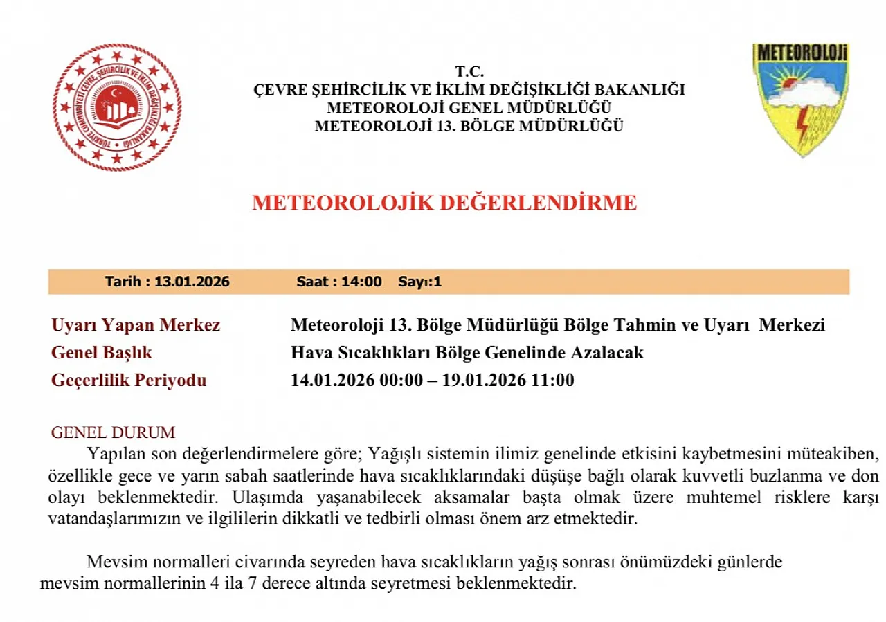 Bölge genelinde etkili olan kar ve sağanak yağış yerini dondurucu soğuklara bırakıyor. Meteoroloji 13. Bölge Müdürlüğü Bölge Tahmin ve Uyarı Merkezi tarafından paylaşılan verilere göre, yağışlı sistemin bölgeyi terk etmesiyle birlikte termometreler sert bir düşüşe geçecek. Tahminler, hava sıcaklıklarının önümüzdeki günlerde mevsim normallerinin 4 ila 7 derece altına kadar ineceğini gösteriyor.