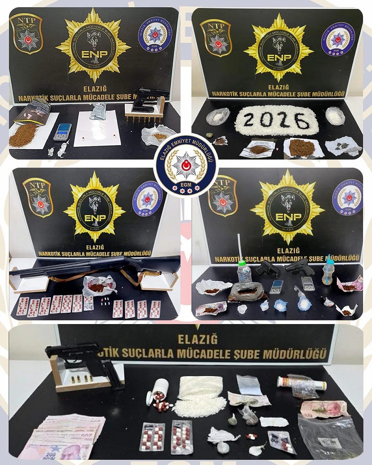 Elazığ’da huzur ve güvenliğin tesisi için düğmeye basan İl Emniyet Müdürlüğü, zehir tacirlerine ve yasa dışı silah taşıyanlara yönelik operasyonlarını artırdı. Narkotik Suçlarla Mücadele ve Asayiş Şube Müdürlükleri tarafından yılbaşından bu yana yürütülen teknik ve fiziki takipler, çok sayıda adrese yapılan eş zamanlı baskınlarla sonuçlandı. Kent merkezi ve ilçelerde gerçekleştirilen çalışmalarda, suç şebekelerinin sokaklara sızmaya hazırladığı yüklü miktarda uyuşturucu madde ve çok sayıda ateşli silah ele geçirildi.