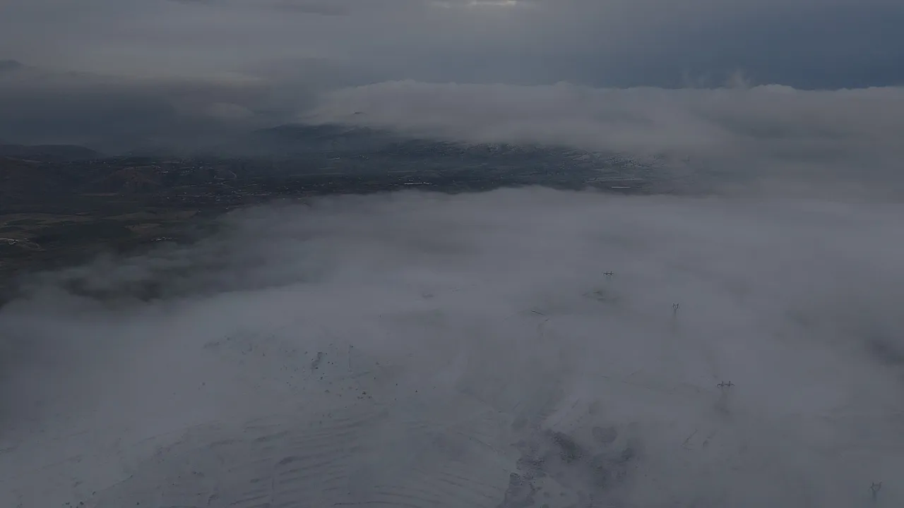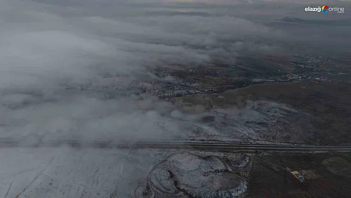 Sabahın ilk ışıklarıyla birlikte merkeze bağlı Nuralı Köyü ve Harput semalarında havalanan dronlar, alışılmışın dışında bir doğa olayını kaydetti. Yaklaşık aynı yükseklikte bulunmasına rağmen, arazinin bir yanı tamamen beyaz örtüyle kaplıyken, hemen birkaç yüz metre ötedeki bölgelerde toprağın rengi hâlâ hakimdi. Vadi aralarına çöken yoğun sis de bu manzaraya eklenince, tek bir karede adeta üç farklı mevsim aynı anda yaşandı.
