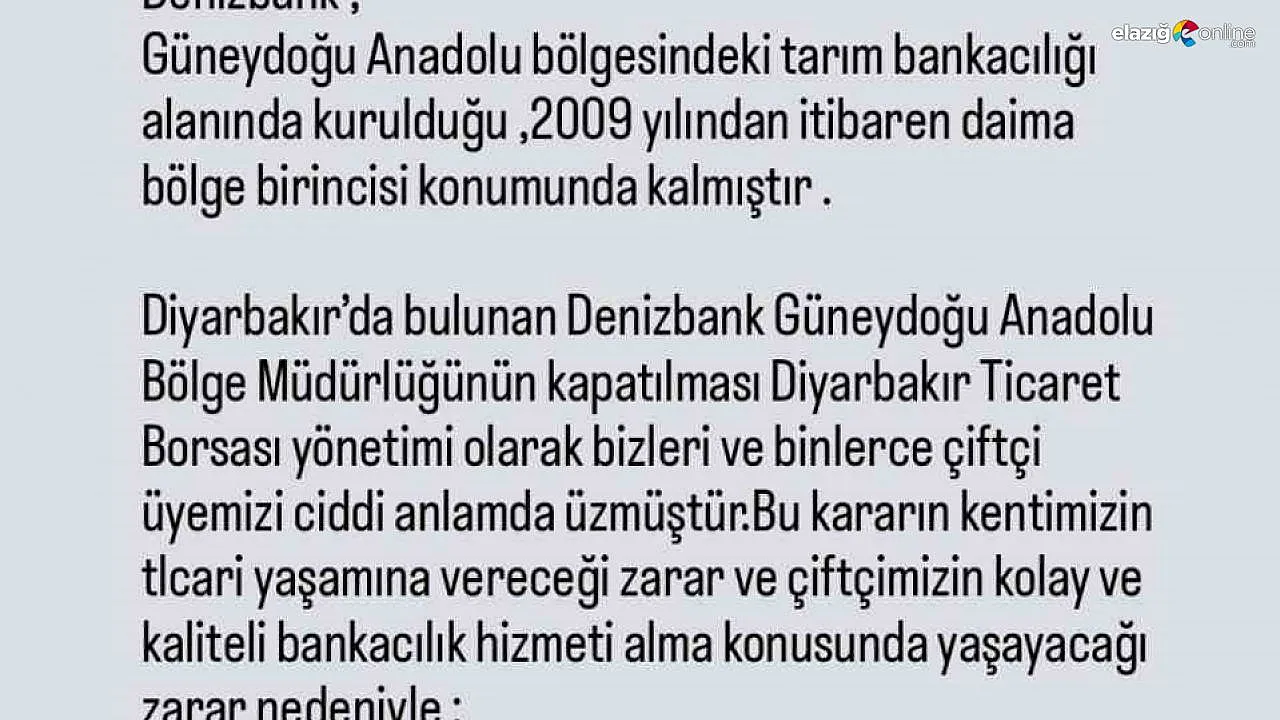 Diyarbakır Ticaret Borsasından yapılan açıklamada, "2009 yılında Diyarbakır’da kurulan Denizbank Güneydoğu Anadolu Bölge Müdürlüğü, özelde kentimizin ve genelde de bölgemizin tarımına değerli hizmetler vermiş ve bölge tarımının gelişimine önemli katkılar sağlamıştır. Bu hizmetlere karşılık olarak çiftçilerimiz Denizbank Güneydoğu Anadolu Bölge Müdürlüğü şahsında Denizbank’a oldukça önemli teveccüh göstermiş ve bunun sonucu olarak Denizbank Güneydoğu Anadolu Bölgesindeki tarım bankacılığı alanında kurulduğu, 2009 yılından itibaren daima bölge birincisi konumunda kalmıştır. Diyarbakır’da bulunan Denizbank Güneydoğu Anadolu Bölge Müdürlüğünün kapatılması Diyarbakır Ticaret Borsası yönetimi olarak bizleri ve binlerce çiftçi üyemizi ciddi anlamda üzmüştür. Bu kararın kentimizin ticari yaşamına vereceği zarar ve çiftçimizin kolay ve kaliteli bankacılık hizmeti alma konusunda yaşayacağı zarar nedeniyle Denizbank Güneydoğu Anadolu Bölge Müdürlüğünün kapatılması kararının geri alınarak Diyarbakır’a ve bölgemize kaldığı yerden hizmet vermeye devam etmesini Diyarbakır Ticaret Borsası Yönetimi ve binlerce çiftçimiz adına talep ediyoruz" denildi.