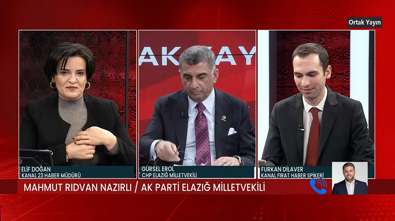 Kanal 23 ve Kanal Fırat ortak yayını, Elazığ siyasetinde günlerdir süren gerginliği bitiren tarihi anlara sahne oldu. Programa telefonla bağlanan AK Parti Milletvekili Mahmut Rıdvan Nazırlı, yaşananları bir 'iletişim kazası' olarak nitelendirerek, 'Biz Ankara'da siyaseti bırakıp Elazığ için Gürsel abiyle istişare halinde çalışıyoruz' dedi.